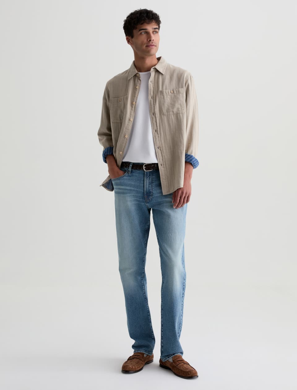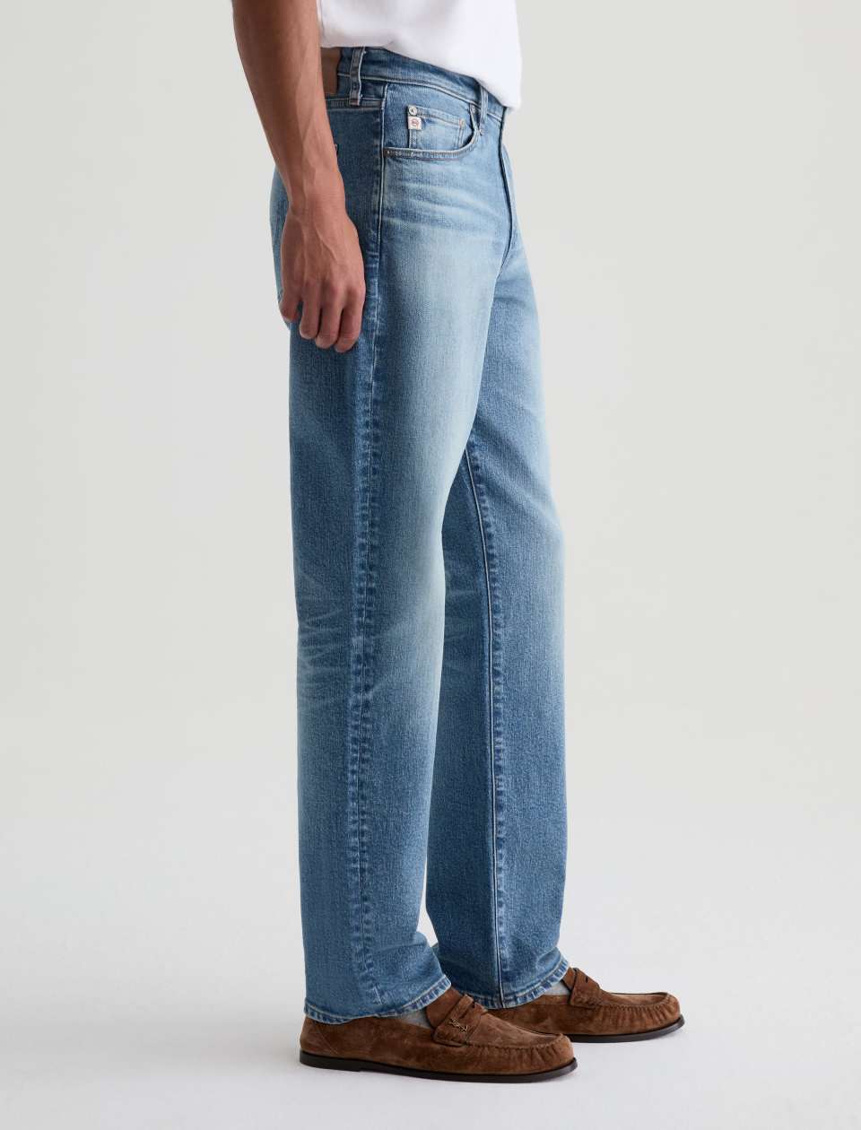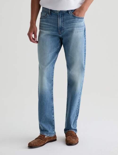 Reggie is crafted from Timeless Comfort Stretch Denim for ultimate comfort and mobility. Reggie’s spacious thigh and straight silhouette from the knee down make this jean the definitive choice for an athletic build. Designed in our light blue wash, 15 Years Volcanic, and finished to emulate 15 years of AG-ed™ wear through fading and worn-down trim as well as whiskering on the front and behind the knees.